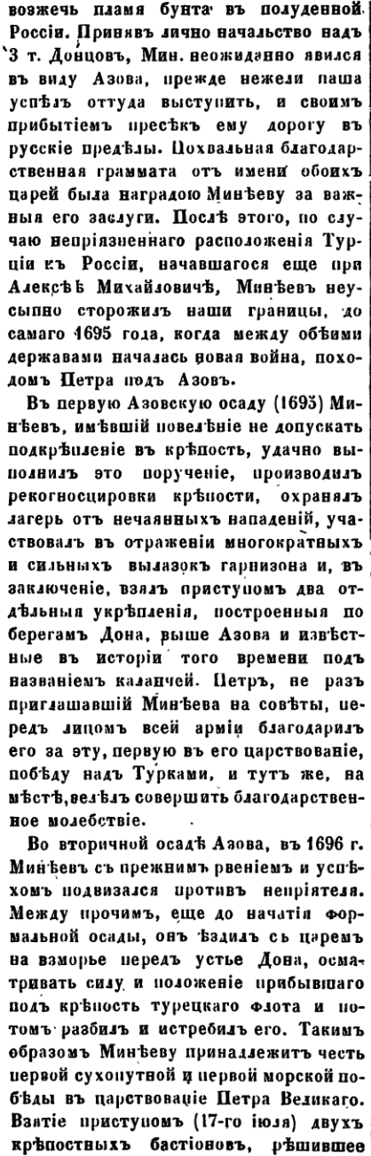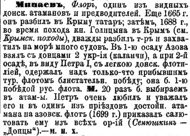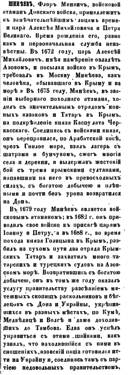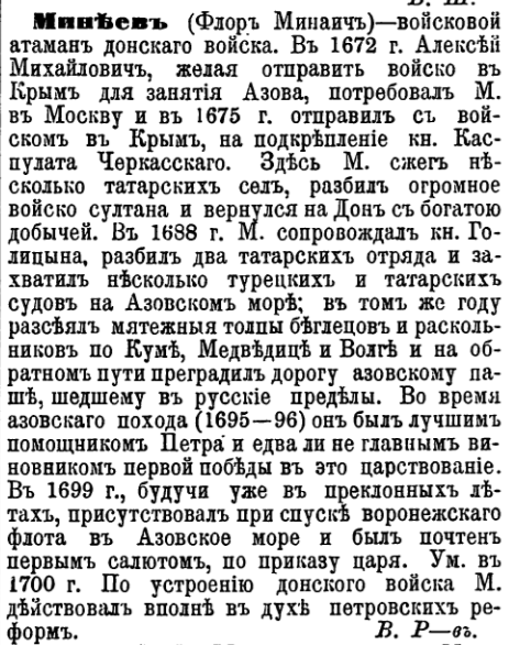 МИНАЕВ, Фрол Минаич, войсковой атаман Донского войска, принадлежит времени и царя Алексея Михайловича, и Петра Великого. Время рождения его, равно как и первоначальная служба, неизвестны. В 1672 году царь Алексей Михайлович, имея намерение овладеть Азовом и посылая войско в Крым, требовал в Москву Минаева, как человека, «бывавшего в Крыму и на море». В 1675 году Минаев в звании выборного походного атамана ходил со значительным отрядом конных казаков и татар в Крым, на подкрепление князя Каспулата Черкасского. Соединясь с войсками князя, он переправился по Арабатской косе через Гнилое море, взял лагерь с шатрами и бунчуком, сжег многие села и деревни, и выдержав жестокий бой с тремя крымскими султанами, напавшими на него в превосходных силах, с богатою добычею и пленными и почти без урона возвратился на Дон.