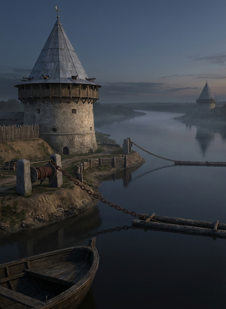 Между башнями поперек Дона была натянута сложная заградительная система. Она представляла собой три ряда железных цепей толщиной в руку,